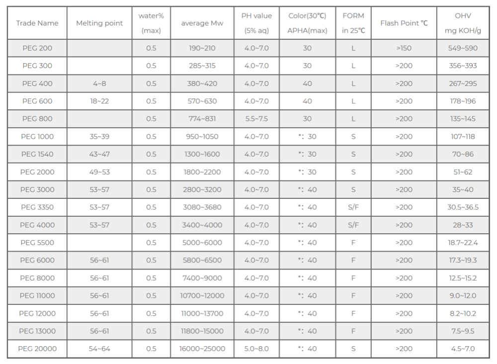 PEG-6000 dan ke atas: Berat molekul tinggi, pepejal keras. Ia mempunyai kekerasan dan takat lebur yang lebih tinggi, dan biasanya digunakan sebagai bantuan pemprosesan logam, pelincir tablet atau agen saiz tekstil, memberikan kesan pelinciran dan penyebaran yang sangat baik.